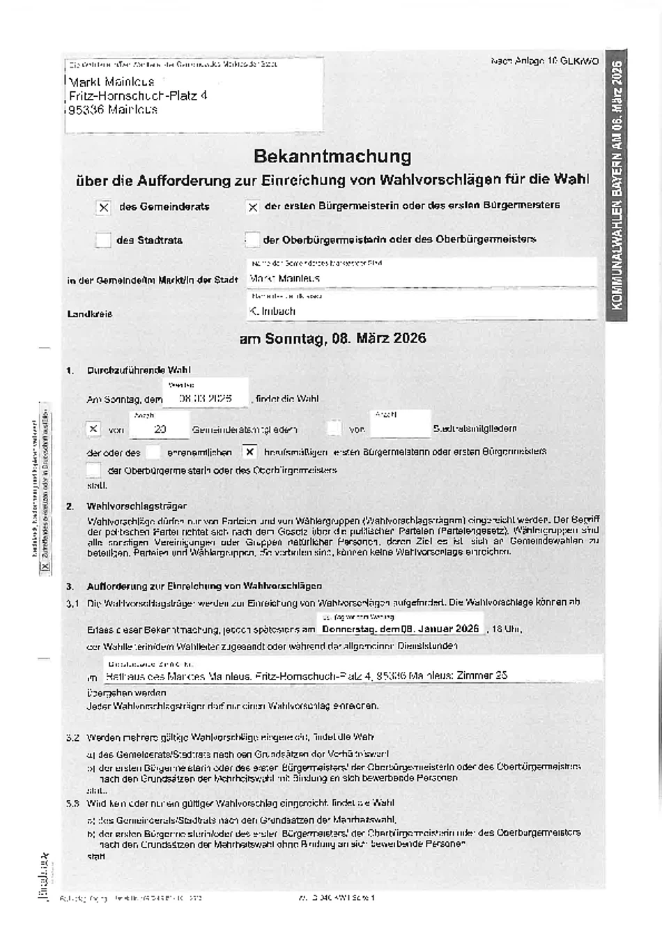 Bekanntmachung über die Aufforderung zur Einreichung von Wahlvorschlägen für die Wahl des Gemeinderats und der ersten Bürgermeisterin oder des ersten Bürgermeisters