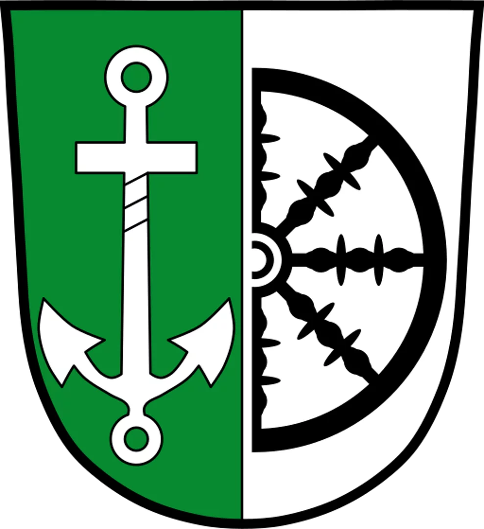 Gespalten von Grün und Silber; vorne ein silberner Floßanker, hinten ein senkrecht stehendes, halbes schwarzes Spinnrad.