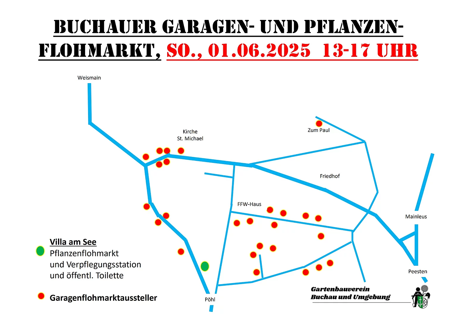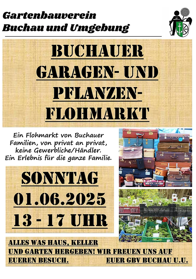 Buchau - Der Gartenbauverein Buchau u.U. startet am 1. Juni in Buchau einen Garagen- und Pflanzenflohmarkt und lädt alle Mitglieder, Garten- und Flohmarktbegeisterten herzlich zu einem ganz besonderen Tag ein! An 24 Garagenflohmarktstationen können Sie von 13 bis 17 Uhr nach Herzenslust stöbern, feilschen und kleine Schätze für Haus und Garten finden. Da ist für jeden etwas dabei. Ein weiteres Highlight ist unser liebevoll bestückter Pflanzenflohmarkt: Von farbenfrohen Stauden über duftende Kräuter bis hin zu Jungpflanzen und Samen – lassen Sie sich inspirieren und nehmen Sie ein Stück Gartenfreude mit nach Hause. Der gesamte Erlös aus dem (Jung-)Pflanzen- und Samenverkauf kommt unserer engagierten Kinder- und Jugendgruppe „Buchauer Früchtla“ zugute, die mit viel Neugier und Tatendrang die Welt des Gärtnerns entdeckt. Für das leibliche Wohl ist bestens gesorgt: In der „Villa am See“ erwarten Sie frisch gebrühter Kaffee und eine große Auswahl an selbstgebackenen Kuchen – genießen Sie eine süße Auszeit in geselliger Runde und lassen Sie sich von der herzlichen Atmosphäre anstecken. Ob Hobbygärtner, Schnäppchenjäger oder Genießer – unser Garagen- und Pflanzenflohmarkt ist der perfekte Anlass, um gemeinsam einen schönen Tag zu verbringen, sich auszutauschen und neue Kontakte zu knüpfen. Bringen Sie Familie, Freunde und Nachbarn mit – wir freuen uns auf viele fröhliche Gesichter und einen Tag voller guter Laune! Kommen Sie vorbei, entdecken Sie das Besondere und unterstützen Sie mit Ihrem Besuch unsere „Buchauer Früchtla“. Wir freuen uns auf Sie!