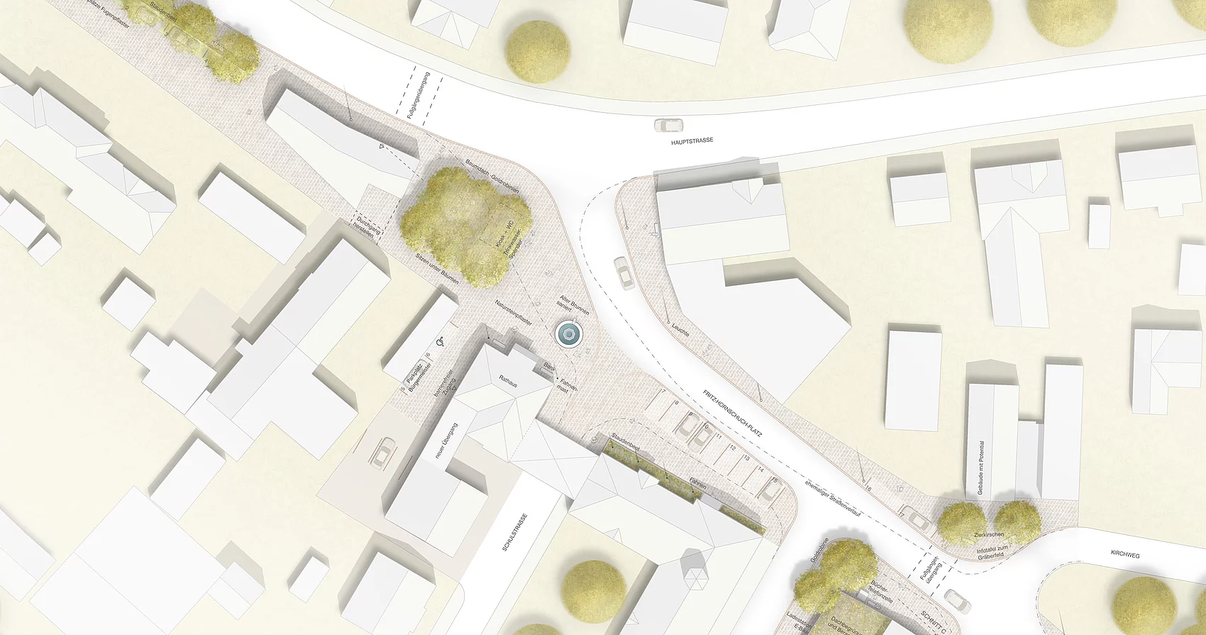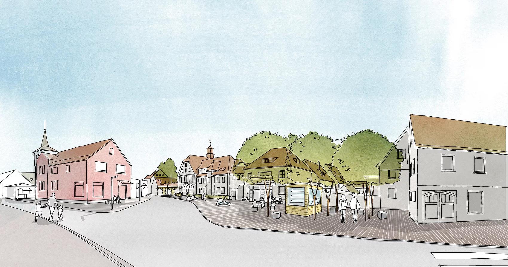 Der Fritz-Hornschuch-Platz wird als zusammenhängender, langgestreckter Raum vom Genossenschaftsplatz über das Rathaus und die Schule bis hin zur Wendeschleife der Schulbusse gesehen. Durch die Verschiebung der Straßenführung nach Norden entsteht eine großzügige Platzfläche, die alle bisherigen und neuen Nutzungen vereint.