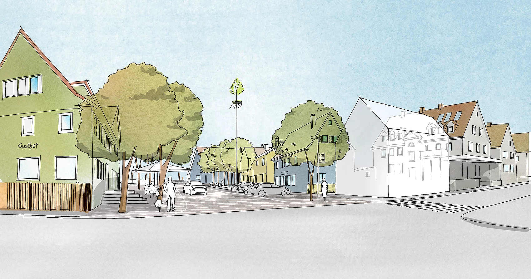 Am Übergang zur Hauptstraße hin bilden bestehende und ein neuer Solitärbaum am ehemaligen Gasthof eine Torsituation und klare Raumkante aus. An dieser Stelle wird ein neues Gebäude vorgeschlagen um die gewünschte Raumkante noch deutlicher ausbilden zu können.