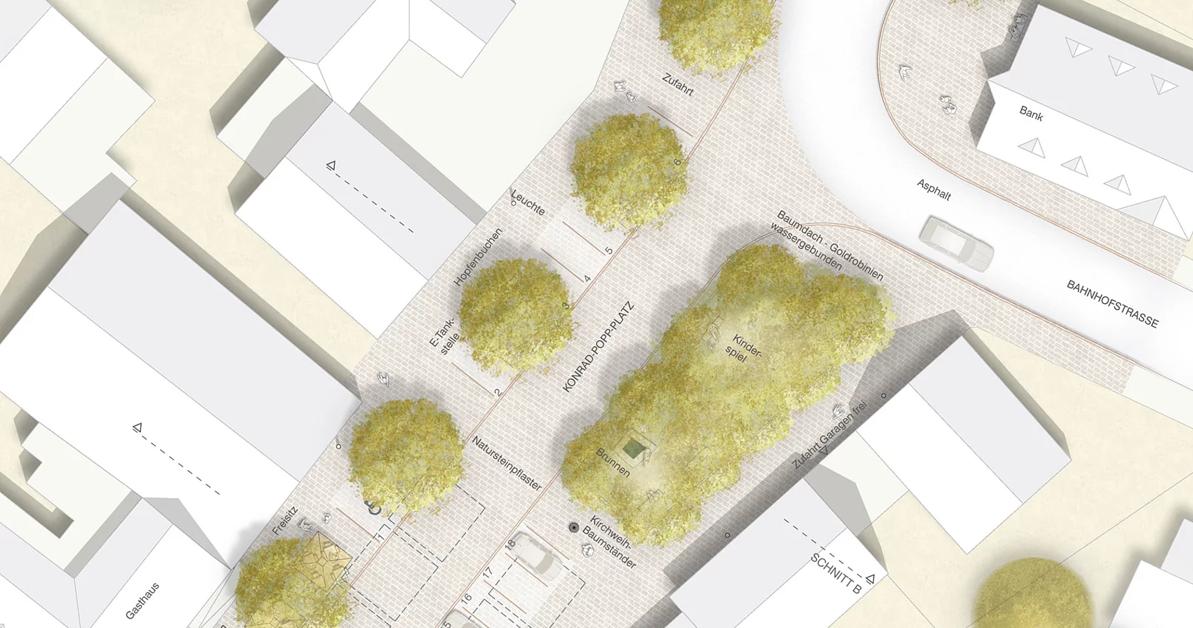 "Eine attraktive Platzfläche für festliche Veranstaltungen und zugleich für den täglichen Aufenthalt zu gestalten ist die Leitidee für den Konrad-Popp-Platz. Die Verkehrsführung des PKW-Verkehrs bleibt unverändert,